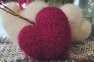 Neuloin joulusydämet huopuvasta villalangasta pyöröneuleena 5 mm:n sukkapuikoilla aran-vahvuisesta huopuvasta villalangasta. Täytin sydämet ennen viimeisiä silmukoita ja päättelemistä villaisilla jämälangoilla.