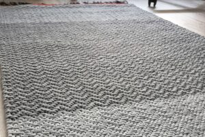 Ensin kangaspuissa syntyi 1,6 m:n vaaleanharmaa pikkumatto. Tummanharmaan maton pituus on 3 m. Sidoksena matoissa on nelivartinen ruusukas.